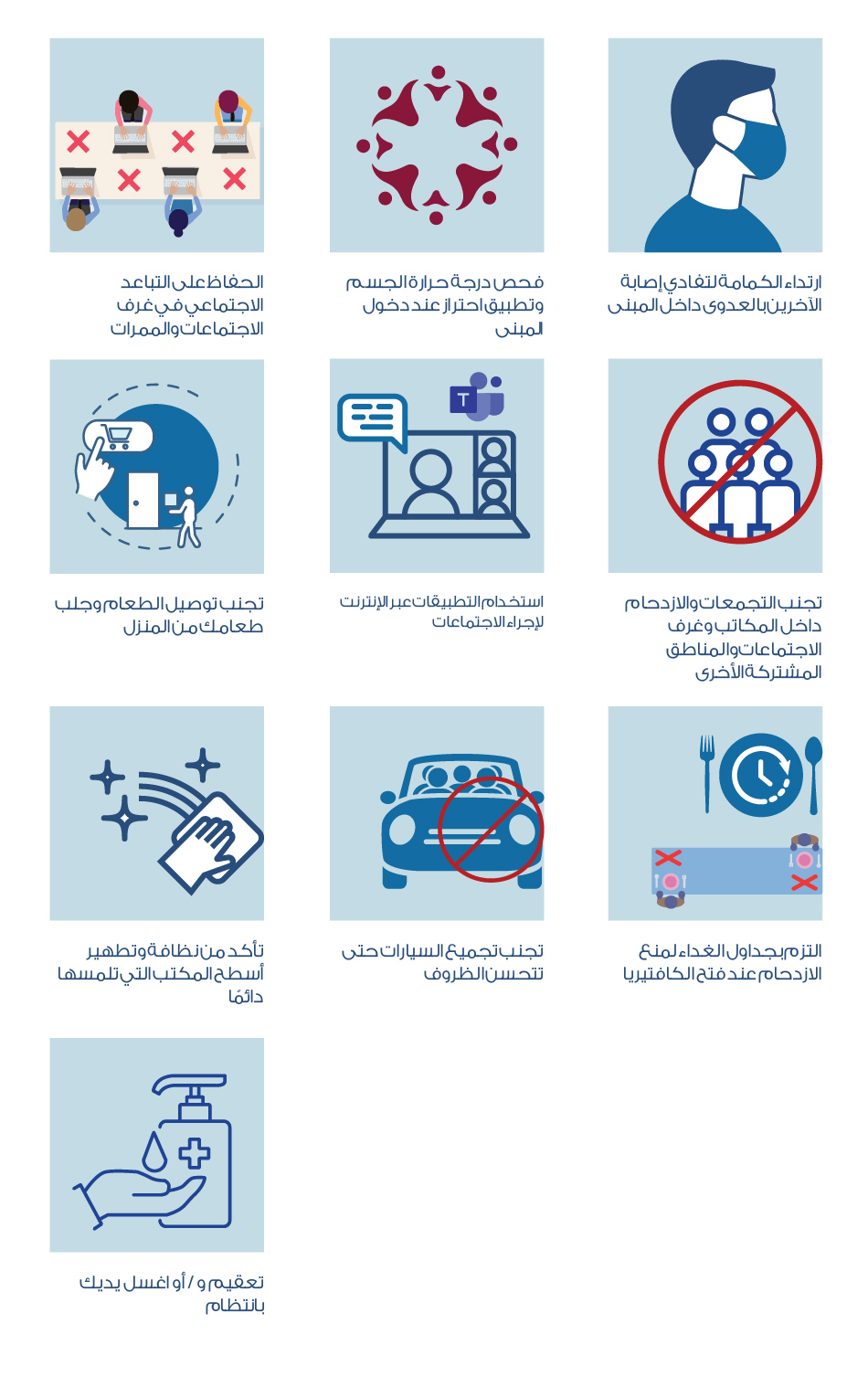 - ضمان التشغيل المرن والأمن مع الحفاظ على 20% من القوى العاملة للعمل من المكتب وفقا للإرشادات والاحترازات الخاصة بجائحة كورونا (كوفيد-19)