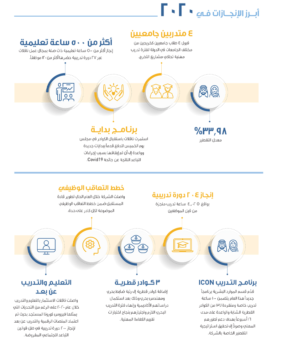 بهدف تطوير قدرات موظفينا على المستويين المهني والشخصي وإيماناً من إدارة الشركة بأن الكادر البشري هو رأس المال الأكثر أهمية من الناحية الاستراتيجية، واصلت ناقلات الاستثمار بالتعليم والتدريب خلال عام 2020 على الرغم من التحديات التي يمثلها فيروس كورونا المستجد بحيث تم اعتماد المنصات الرقمية والتدريب عن بعد لمواصلة تقديم دوراتنا التدريبية المقررة.
