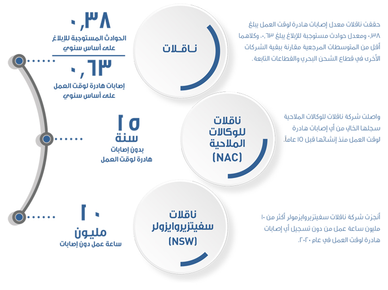 إن أداء ناقلات القوي في مجال السلامة يؤكد التزام الشركة وجميع موظفيها بتحقيق بيئة عمل خالية من الحوادث والإصابات.