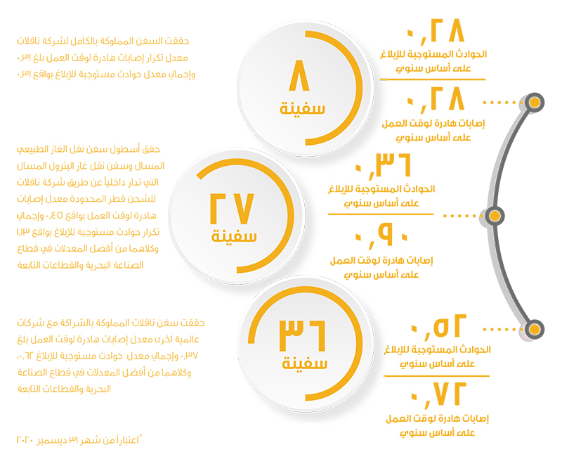 «حافظ اسطول ناقلات على خلوه من اي اصابة بحالة كورونا (كوفيد-19) خلال عام 2020، حيث تحتل سلامة وصحة موظفينا المراتب الأولى في سلم أولوياتنا التي تشمل أيضاً حماية البيئة وممتلكات الشركة أينما وجدت»