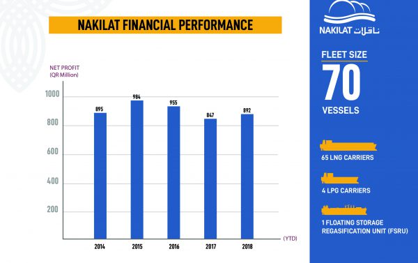 أعلنت اليوم شركة قطر لنقل الغاز المحدودة “ناقلات” عن نتائجها المالية للربع الرابع من السنة المنتهية في 31 ديسمبر 2018، حيث حققت الشركة صافي ربح قدره 892 مليون ريال في 2018 (أو 1.61 ريال للسهم الواحد) وبزيادة قدرها 5.3%.