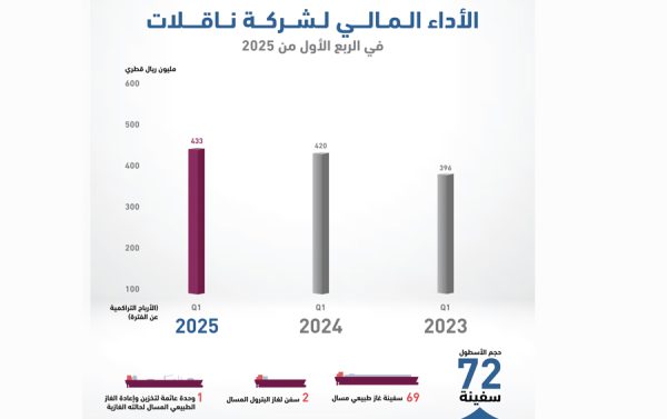 ناقلات تحقق صافي ربح قدره 433 مليون ريال قطري عن الربع الأول من العام 2025، بزيادة قدرها 3.2%