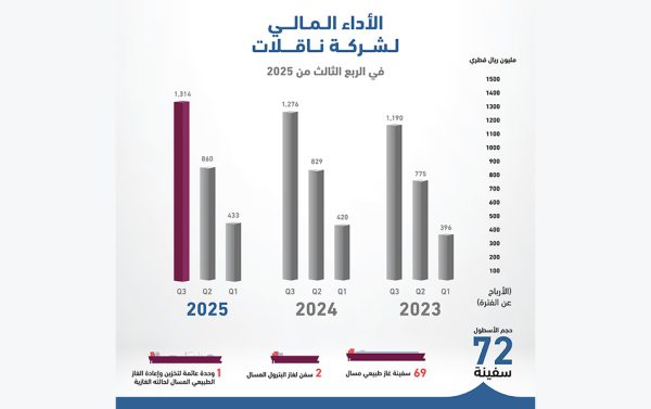 ناقلات تعلن عن تحقيق صافي ربح قدره 1.31 مليار ريال قطري عن الربع الثالث من العام 2025، بزيادة قدرها 3.0٪