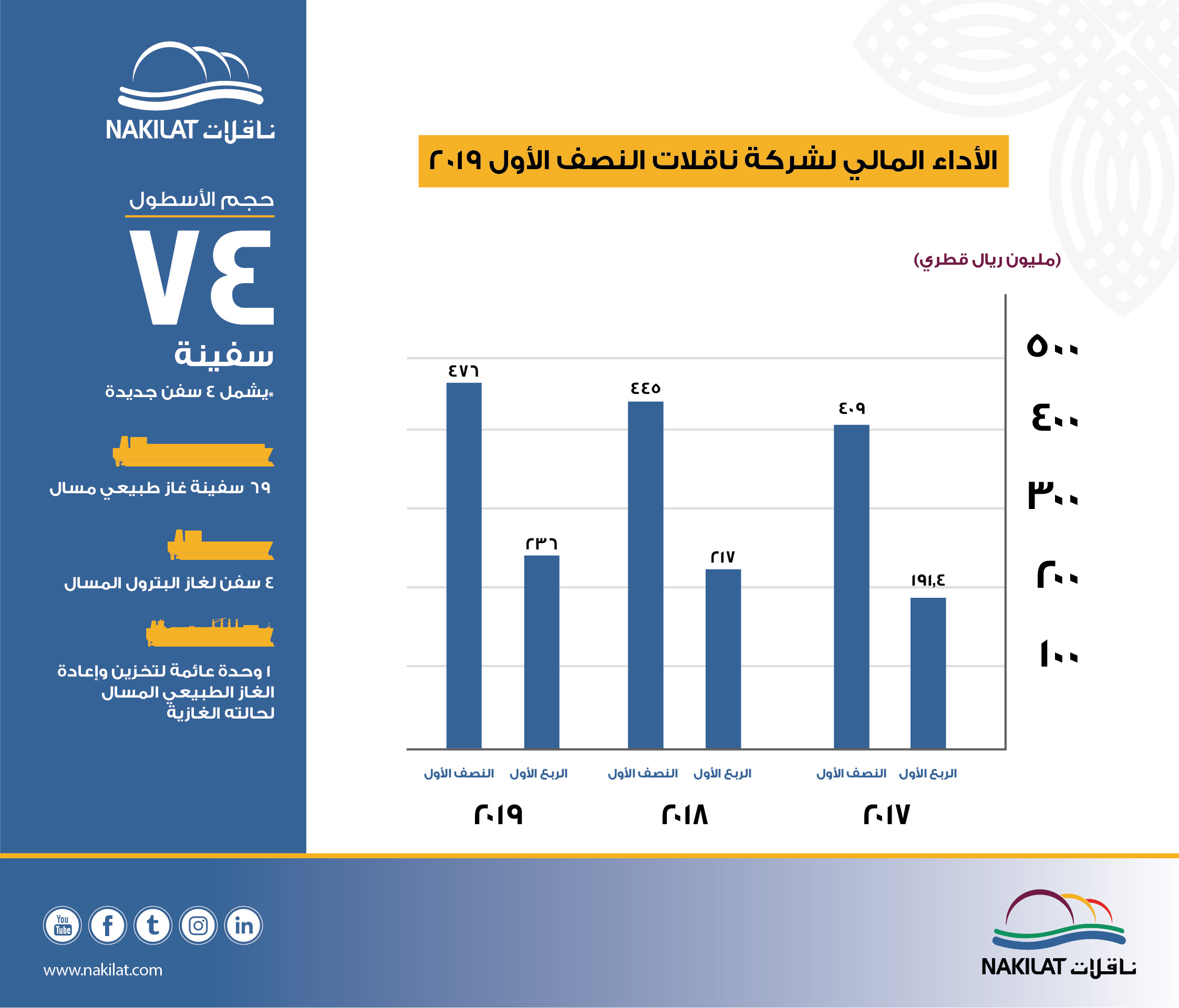أعلنت شركة قطر لنقل الغاز ( ناقلات) عن نتائجها المالية للنصف الأول من السنة المنتهي في 30 يونيو 2019، حيث حققت الشركة صافي ربح بلغ 476 مليون ريالاً قطرياً مقارنة مع 445 مليون ريالاً قطرياً عن نفس الفترة من عام 2018، أي بزيادة قدرها 7٪.