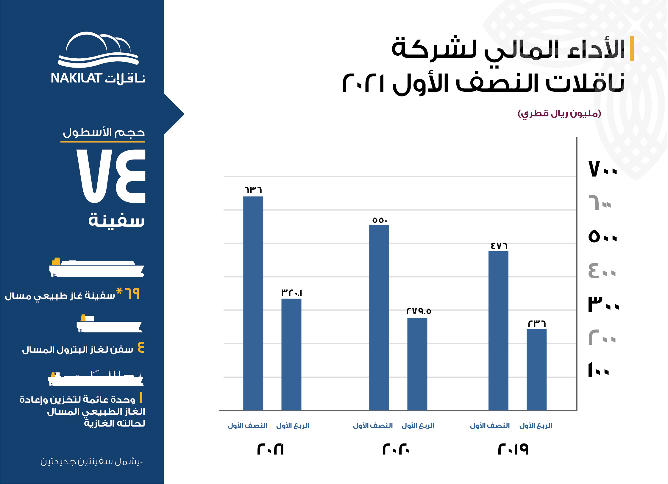 أعلنت شركة قطر لنقل الغاز المحدودة (ناقلات) عن نتائجها المالية للنصف الأول من السنة المنتهية في 30 يونيو 2021، حيث حققت الشركة صافي ربح بلغ 636 مليون ريالاً قطريًا مقارنة مع 550 مليون ريالاً قطريًا عن نفس الفترة من عام 2020، بزيادة قدرها 15.6٪.