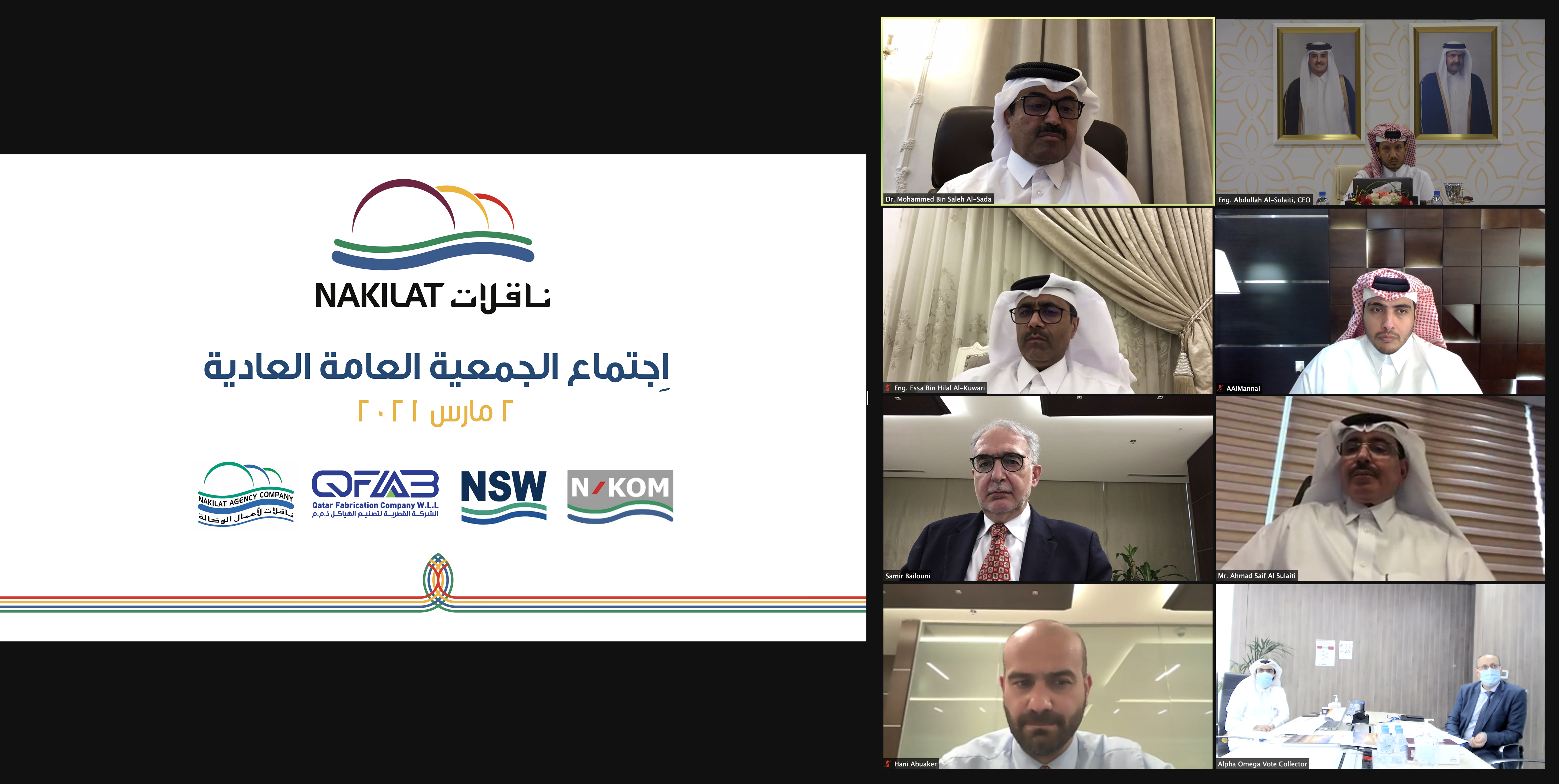 عقدت شركة ناقلات اجتماع الجمعية العامة العادية برئاسة سعادة الدكتور محمد بن صالح السادة رئيس مجلس الإدارة. تم خلال الاجتماع الذي انعقد عن بعد (افتراضيا) استعراض النتائج المالية للشركة حيث حققت ناقلات خلال عام 2020 صافي ربح قدره مليار ومائة وواحد وستون مليون ريال قطري أي بزيادة قدرها 15.7%. كما تم التصديق على جميع البنود المدرجة على جدول أعمال اجتماع الجمعية العامة العادية.