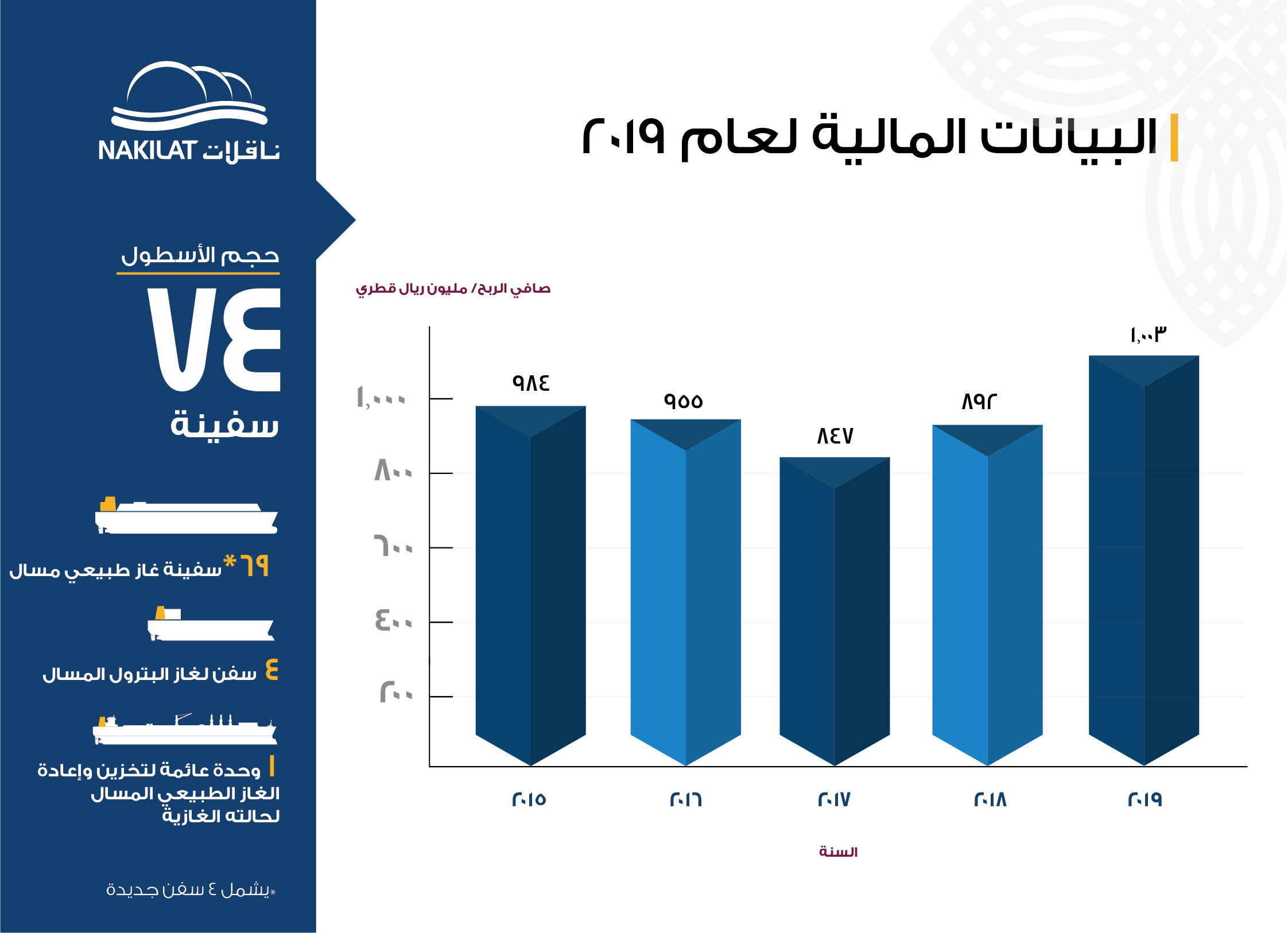 ناقلات تحقق أرباح قياسية تتعدى مليار ريال قطري وهي الأعلى منذ تأسيس الشركة ارتفاع أرباح ناقلات بنسبة 12.4٪ إلى 1,003 مليون ريال قطري في السنة المالية 2019
