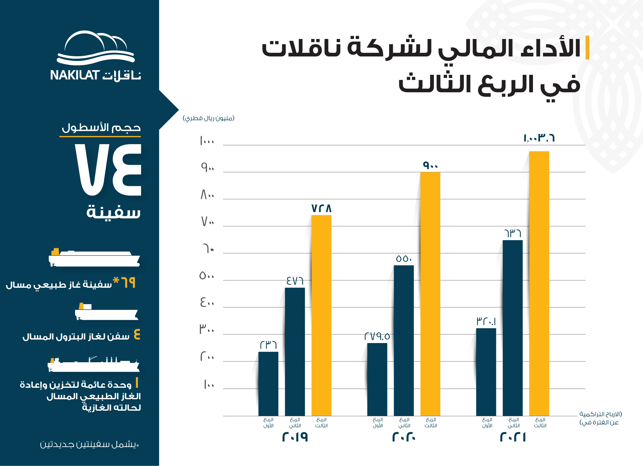 أعلنت شركة قطر لنقل الغاز المحدودة (ناقلات) نتائجها المالية عن الربع الثالث من السنة المالية الحالية والمنتهية في 30 سبتمبر 2021؛ إذ حققت الشركة صافي ربح قدره 1,003.6 مليون ريال قطري، ما يمثل زيادة سنوية نسبتها 11.5% مقارنة بصافي الربح البالغ 900 مليون ريال قطري عن الفترة نفسها من السنة المالية 2020.