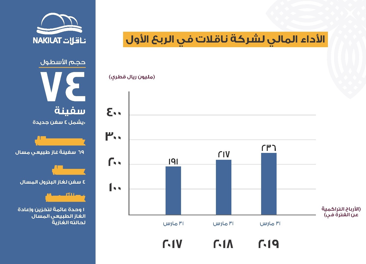 أعلنت شركة قطر لنقل الغاز المحدودة (ناقلات) عن نتائجها المالية للربع الاول المنتهي في 31 مارس 2019 حيث بلغ صافي الربح 236 مليون ريال قطري مقارنة بحوالي 217 مليون ريال قطري في نفس الفترة من العام المنصرم وبزيادة قدرها 9%. وﻳﻌﻜﺲ سبب هذا الأداء اﻟﻘﻮي اﻟﺬي أﺣﺮزﺗﻪ اﻟﺸﺮﻛﺔ الى الاستحواذ على حصة في سفينتين جديدتين لنقل الغاز الطبيعي المسال، وكذلك الإستحواذ على حصة في وحدة عائمة لتخزين وإعادة الغاز المسال لحالته الطبيعية FSRU وإضافتها لأسطول الشركة ورفع نسبة الكفاءة التشغيلية وترشيد المصروفات الادارية والعمومية. لقد ساهمت هذه الإضافات الجديدة والإجراءات في تطور الأداء التشغيلي، مما انعكس مردوده المباشر على مؤشرات الأداء المالي بتحقيق إيرادات مالية متميزة.